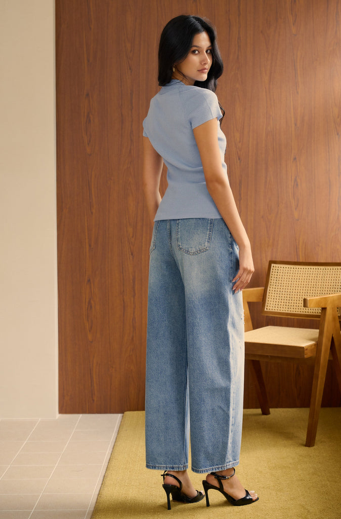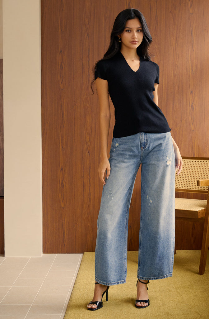 Sparkly v neck knit top in blue is backordered. We will ship it out separately after 21-30 business days.